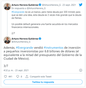 Mediante su cuenta de Twitter, Herrera señaló que los desarrollos recientes en torno al promotor inmobiliario chino “ponen de manifiesto la forma en que los riesgos financieros se van transformando”.