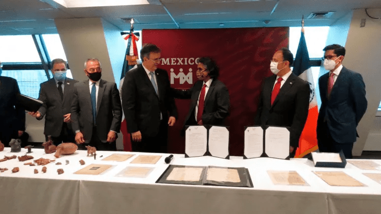 “Hoy (jueves) fueron entregados a SRE (Secretaría de Relaciones Exteriores) y puestos bajo custodia de nuestro consulado en Nueva York para ser trasladados a la CDMX (Ciudad de México)”, añadió el funcionario, al subrayar que las piezas “se habían vendido ilegalmente”.