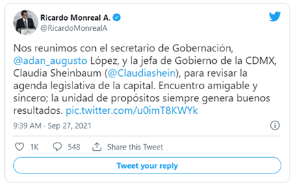 «Nos reunimos con el secretario de Gobernación, @adan_augusto López, y la jefa de Gobierno de la CDMX, Claudia Sheinbaum (@Claudiashein), para revisar la agenda legislativa de la capital. Encuentro amigable y sincero; la unidad de propósitos siempre genera buenos resultados», escribió Monreal Ávila.