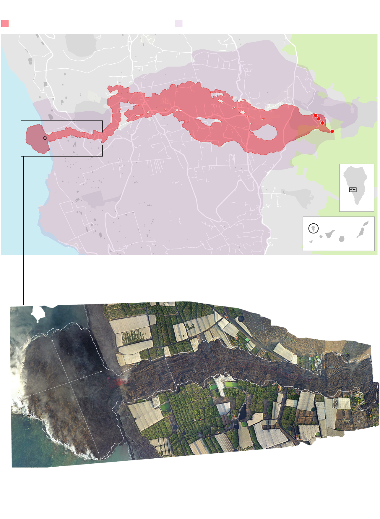 Las últimas estimaciones que arroja el satélite Copernicus, de la Unión Europea (datan de este miércoles), calculan la superficie destruida en tierra y ganada al mar en 338,3 hectáreas y la que está cubierta de ceniza, en 1.752,8. Hasta el momento, las edificaciones afectadas por el magma se elevan a 981, de las cuales 855 están destruidas. Además, 29,8 kilómetros de carreteras han sido alcanzados y 27,4 ya están completamente sepultados por la lava.