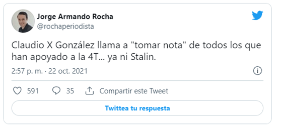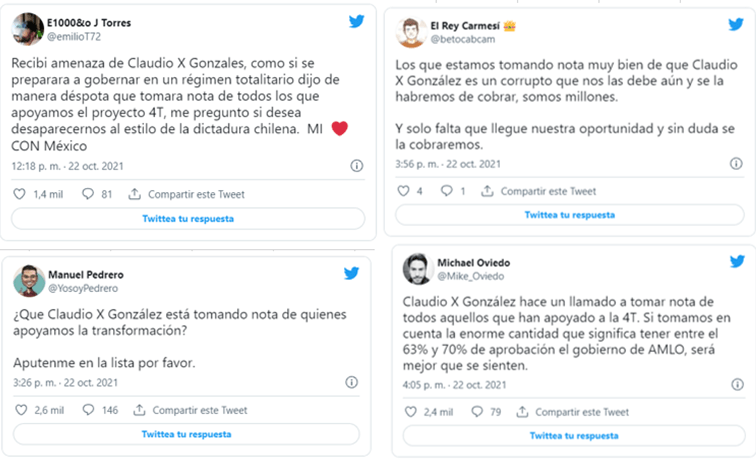 Realidades.- Luego de que el empresario y líder de la coalición “Va por México”, Claudio X. González, dijera que a través de sus redes sociales, que ‘tomarían’ nota a las personas que apoyaron y apoyen a la llamada Cuarta Transformación, los simpatizantes del Presidente Andrés Manuel López Obrador le respondieron.