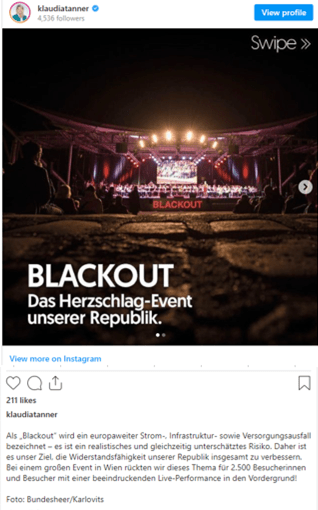 Siguiendo el informe anual ‘Sicher, und morgen?’, elaborado por expertos que tratan de adelantarse a posibles peligros, la segunda amenaza más probable para Austria es un apagón, que podría producirse por una epidemia global, un atentado terrorista, ataques cibernéticos, un pico de la demanda o una sobrecarga del sistema. De acuerdo a esa hipótesis, el Ministerio austríaco ha recomendado a la población almacenar comida, bebida y medicamentos.