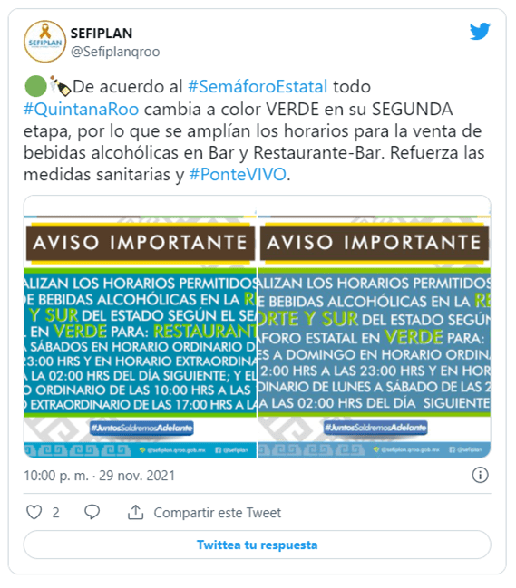 La Secretaría de Finanzas y Planeación (Sefiplan) informó, mediante un comunicado, que el horario permitido en los bares es de lunes a domingo, de las 12:00 a las 23:00 horas, y en horario extraordinario, de lunes a sábado, de las 23:00 a las 02:00 horas del día siguiente.