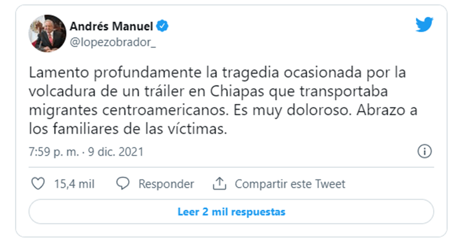 Ante la tragedia ocurrida esta tarde en Chiapas, en la que 49 migrantes perdieron la vida y varios más resultaron heridos, el presidente López Obrador envió sus condolencias a los familiares de las víctimas.