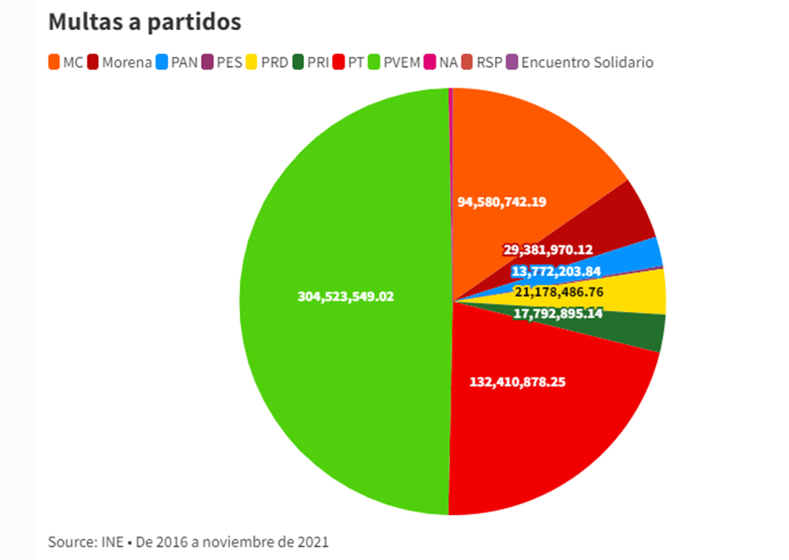Según informes del organismo electoral, el partido encabezado por Karen Castrejón, suma en total 304, 523, 549 pesos en multas, lo que representa casi 50% del total de lo sancionado por el INE de 2016 a noviembre de 2021. Luego le sigue el Partido del Trabajo (PT) con 21.4% del total; Movimiento Ciudadano, 15.3%; Morena, 4.7%, y el PRD, con 3.4%.