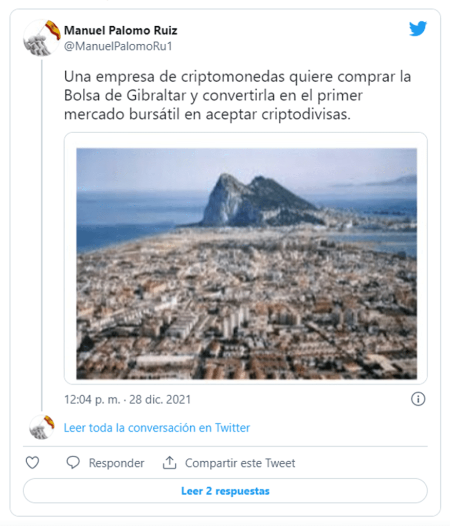 Una empresa de criptomonedas quiere comprar la Bolsa de Gibraltar y convertirla en el primer mercado bursátil en aceptar criptodivisas. pic.twitter.com/PjOrbODHiH— Manuel Palomo Ruiz (@ManuelPalomoRu1) December 28, 2021