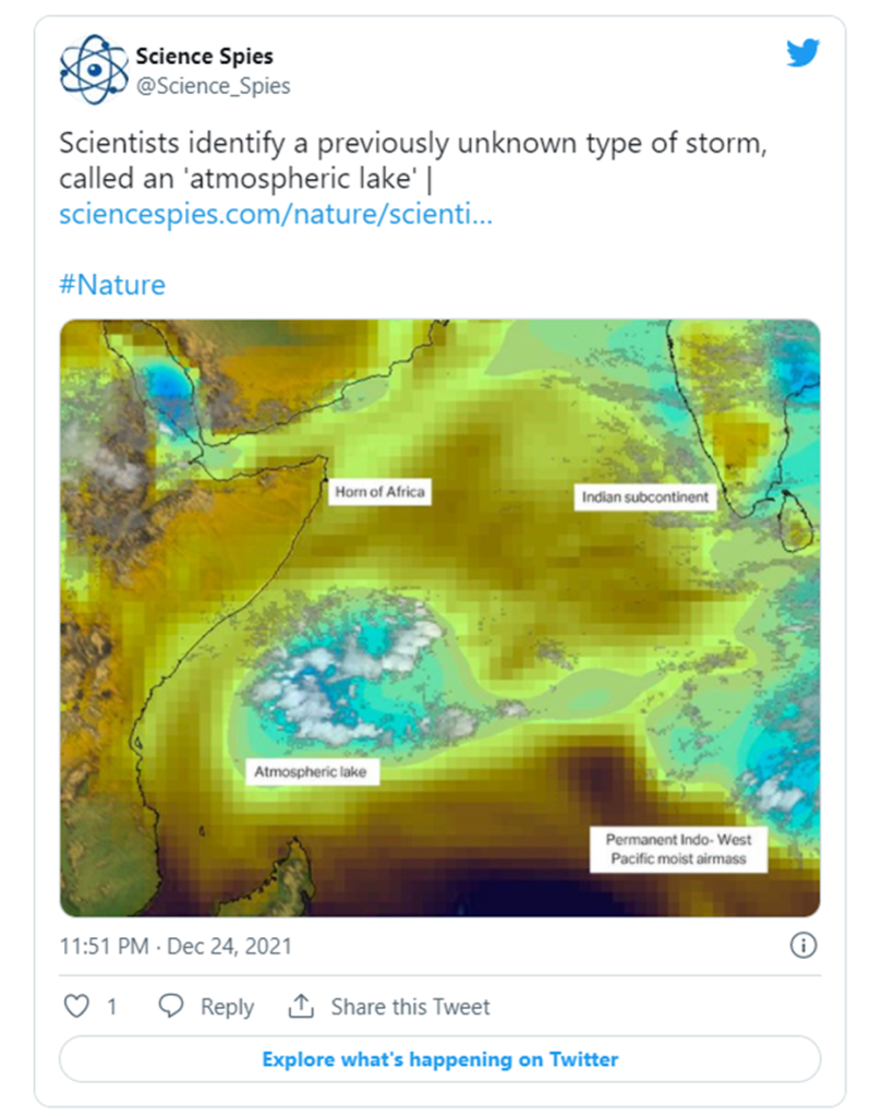 Un científico atmosférico ha observado un nuevo tipo de fenómeno meteorológico que se forma predominantemente en el océano Índico occidental: denominados «lagos atmosféricos», con tormentas compactas, de movimiento lento y ricas en humedad, llevan agua a las tierras bajas secas de la costa de África oriental.