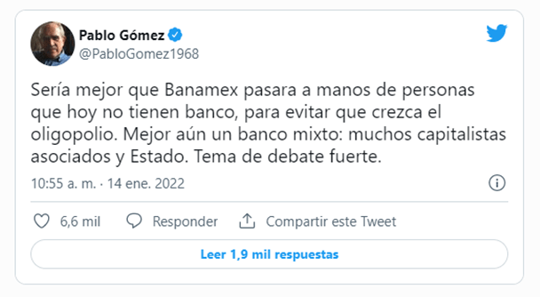 A través de su cuenta de Twitter, el funcionario consideró que el banco debe quedar en manos de empresarios que no tengan en su poder otra institución bancaria y con ello se motive un oligopolio financiero.