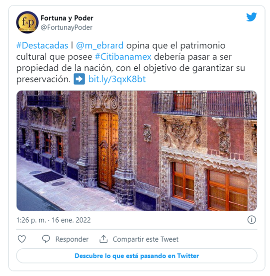 Al respecto, el secretario de Relaciones Exteriores, Marcelo Ebrard, propuso hoy que el patrimonio cultural que integra Citibanamex pase a ser propiedad de la nación, con el objetivo de garantizar su preservación.