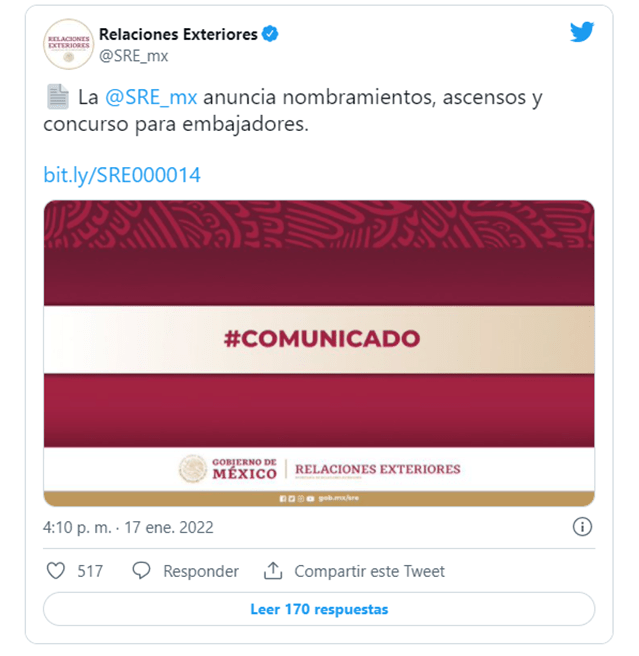 La Cancillería informó que el presidente de la República propuso consideración del Senado de la República la designación de nuevos titulares en diversas representaciones de México en el exterior.