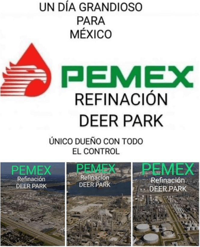 Se cerró con éxito la compra total de la refinería de Deer Park, (…) al adquirirse el 50.005% de la participación accionaria de Shell, con lo que el Estado mexicano tendrá la propiedad total de esta instalación”, informó Pemex.