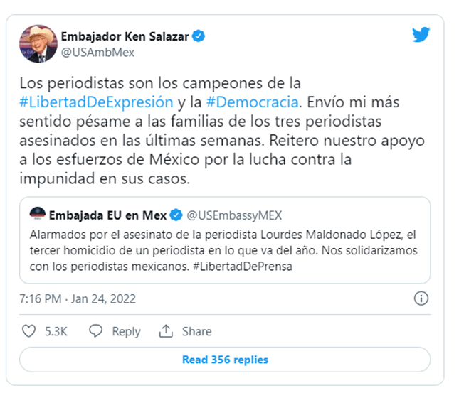 La noche del lunes el embajador de Estados Unidos en México, Ken Salazar, expresó su solidaridad, envió sus condolencias y reiteró su apoyo a los esfuerzos de México por la lucha contra la impunidad.