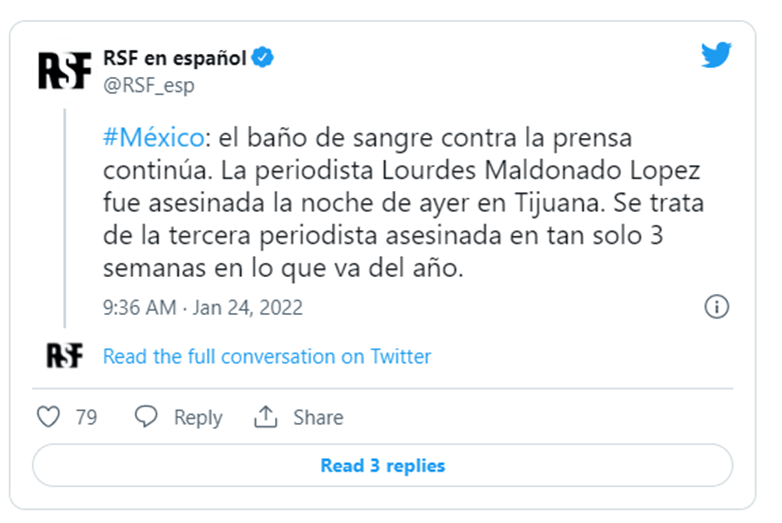 “El baño de sangre contra la prensa continúa. La periodista Lourdes Maldonado Lopez fue asesinada la noche de ayer en Tijuana. Se trata de la tercera periodista asesinada en tan solo 3 semanas en lo que va del año”, señaló en su cuenta de Twitter.