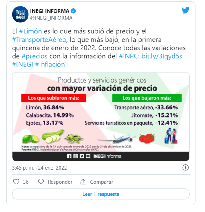 Si vemos el aumento sólo de manera quincenal, es decir, frente a lo observado en la segunda parte de diciembre de 2021, se registró un incremento en su precio de 36.84 por ciento, lo que implicó el mayor impacto en la inflación del periodo.