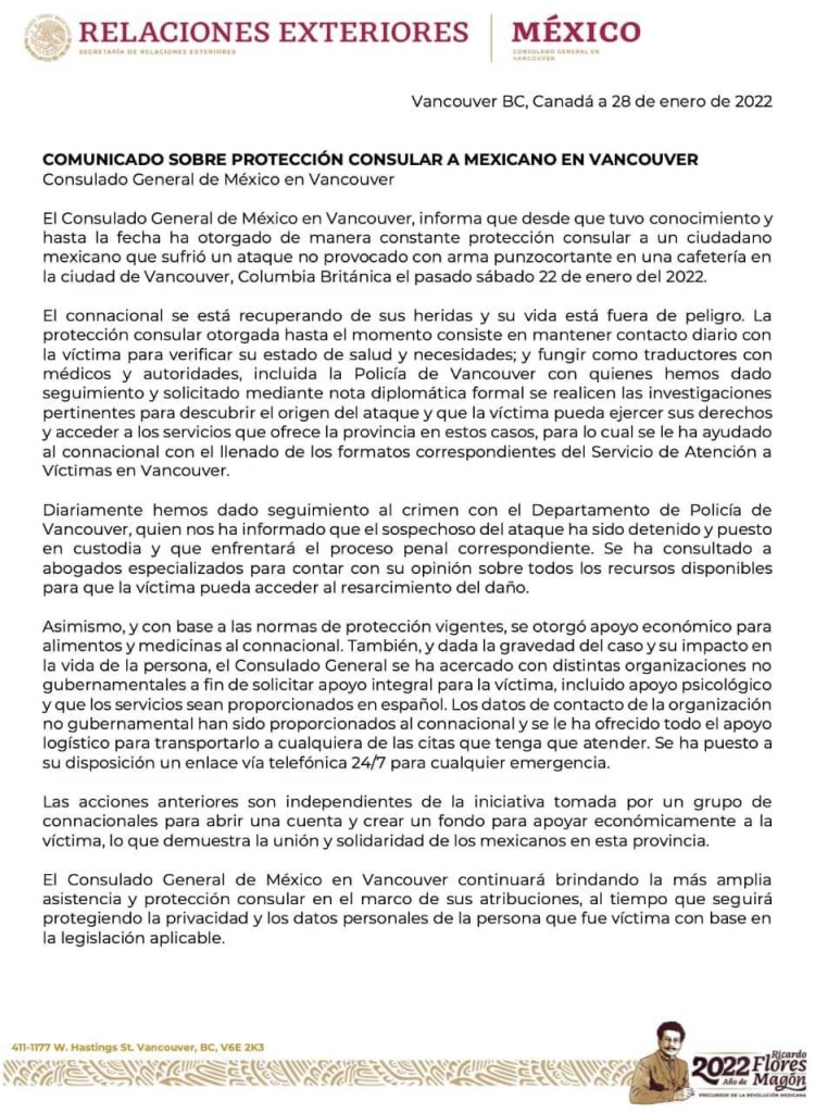 El consulado mexicano en Vancouver ha confirmando la agresión y ya emitió un comunicado al respecto pero no ha revelado la identidad del varón que se observa agredido en el video.