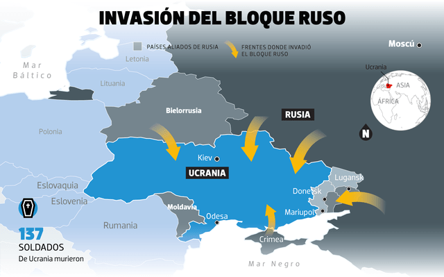 El mandatario indicó que al menos 137 ucranianos, «137 héroes», murieron durante el primer día de la ofensiva rusa y que 316 resultaron heridos durante los enfrentamientos. El presidente decretó también una movilización militar general para tratar de contener la ofensiva rusa que, en menos de 24 horas desde su inicio, se acerca peligrosamente a la capital Kiev.