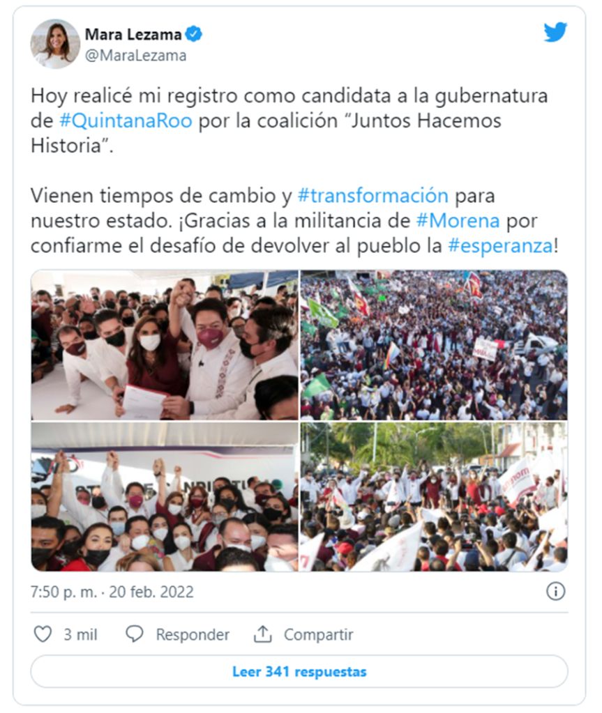 Mara Lezama, quien actualmente es la presidenta municipal de Benito Juárez (Cancún), contenderá el próximo 5 de junio de la mano de la coalición “Juntos Haremos Historia”, conformado por Morena, el Partido del Trabajo (PT) y el Partido Verde Ecologista de México (PVEM).