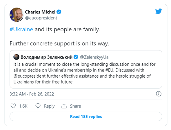 Minutos después, el presidente del Consejo Europeo respondió a este mensaje al presidente ucraniano asegurando que «Ucrania y su gente son familia», así como que «más apoyo concreto está en camino» por parte de la UE.
