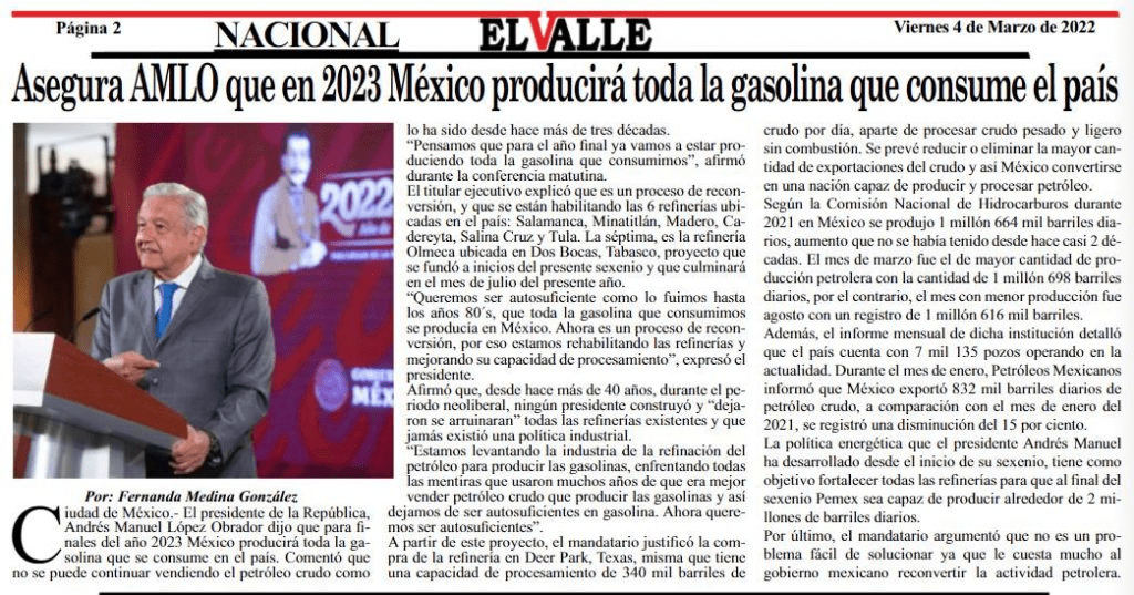 En contexto, el mandatario dio a conocer este jueves que a finales del año 2023, México producirá toda la gasolina que se consume en el país.
