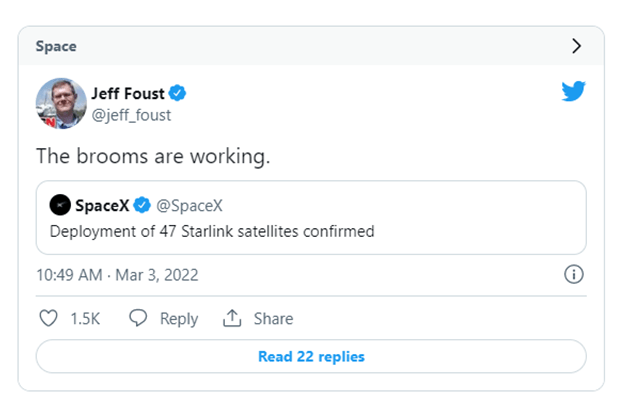 «Palos de escoba estadounidenses», se burló en un tuit el mismo jefe de SpaceX, Elon Musk. En Twitter, Musk publicó un vídeo del cohete Falcon 9 desplegado otros 47 de sus satélites de transmisión de Internet Starlink.