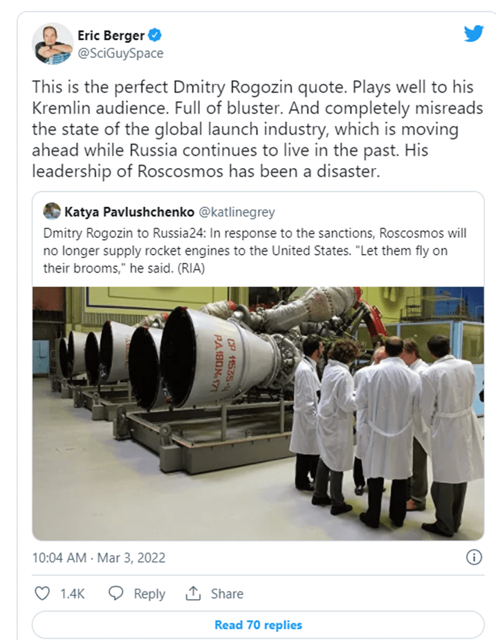 Esta es la cita perfecta de Dimitri Rogozin. Se adapta bien a su público del Kremlin. Llena de fanfarronería. Y malinterpreta completamente el estado de la industria mundial de lanzamientos, que avanza mientras Rusia sigue viviendo en el pasado. Su dirección de Roscosmos ha sido un desastre», aseguró Berger.