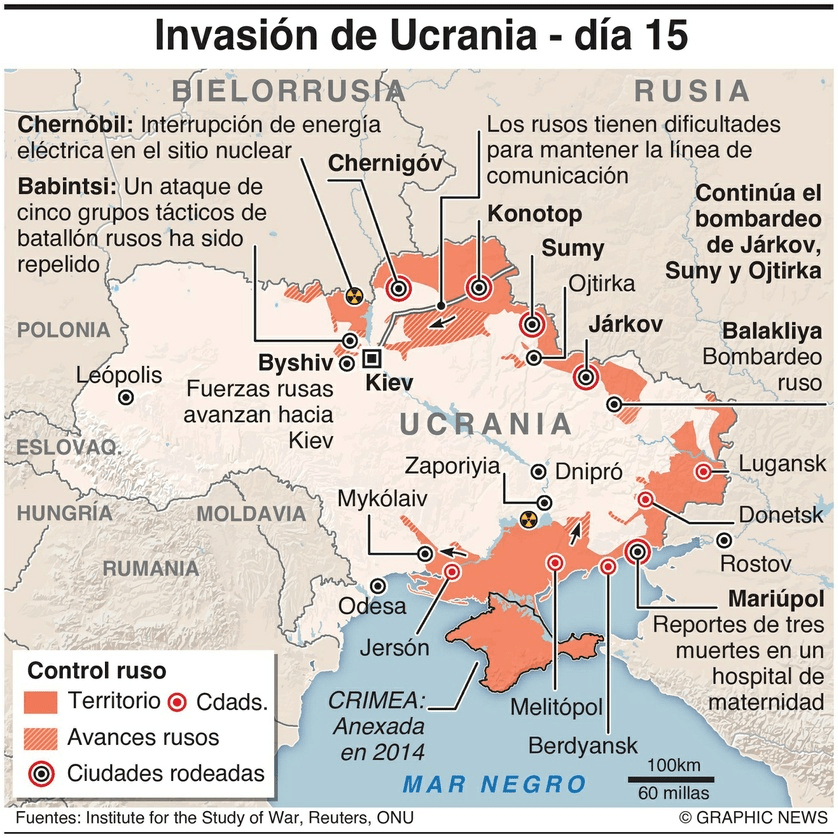 «Actualmente, alrededor del 50 por ciento de nuestras empresas no están operando, y las que todavía están operando no lo están haciendo al 100%», señaló Oleg Ustenko, principal asesor económico del presidente ucranio Volodimir Zelensky.