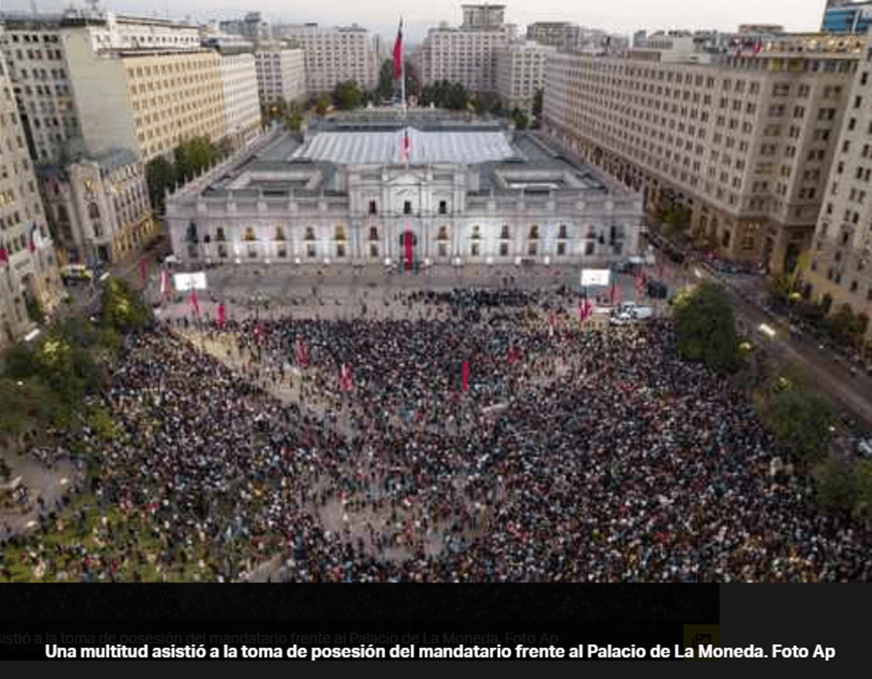 “Tengo mucha esperanza en lo que viene, el país debe cambiar”, expuso una mujer; otra recordaba 1970, cuando asumió el mandatario Salvador Allende: “Yo tenía 15 años y vine con mi madre y mi padre, estoy pensando en ellos”. Un hombre de mediana edad expresaba su anhelo de que “se logren pensiones decentes”, una de las demandas más sentidas. Otro, más entrado en años, decía estar “muy contento; recuerdo cuando años atrás asumía Allende, ojalá que haga las mismas cosas: nacionalizar el agua y la minería; que lo dejen gobernar, que lo dejen gobernar”. “Que cambie la situación de los chilenos, que el sueldo mínimo suba”; “no le tiene miedo a la gente, él se acerca a las personas”, resumía un joven. Y es que cada vez que pudo salir del protocolo y de la seguridad policial, se acercó a las personas, tocó sus manos, recibió regalos, dibujos de niños y, en un gesto de entereza política, en la Plaza de la Constitución, caminó hasta el monumento de Allende ante el cual inclinó su cabeza.