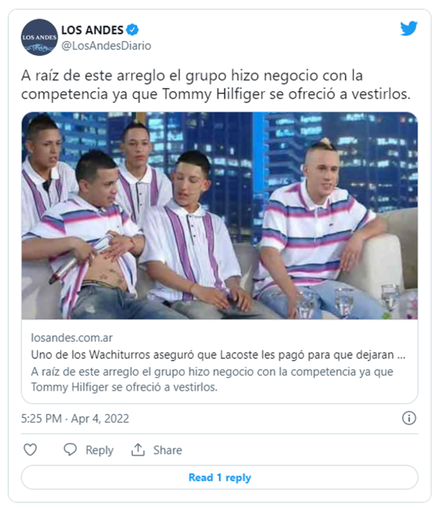 Ocurrió en Argentina. La banda de cumbia Wachiturros recibió dinero de Lacoste a cambio de que sus integrantes no usaran indumentaria de esa marca en sus shows ni en las presentaciones en programas de TV.