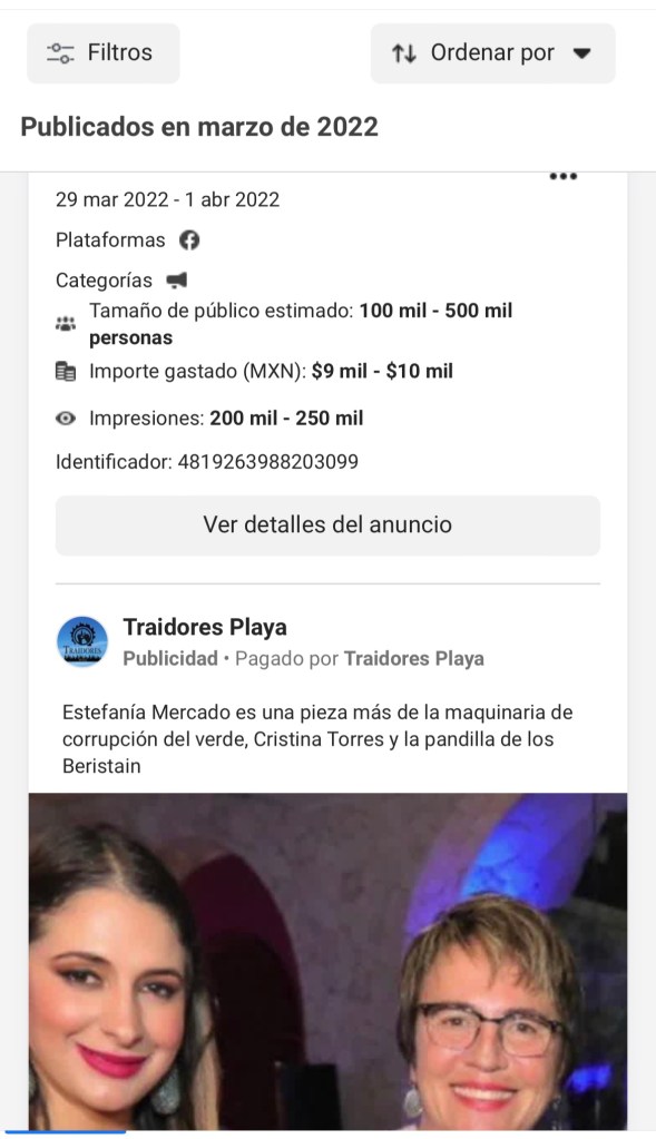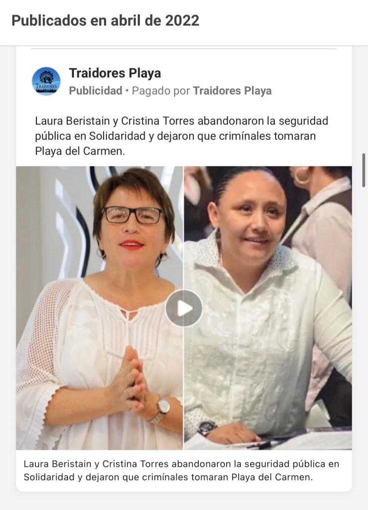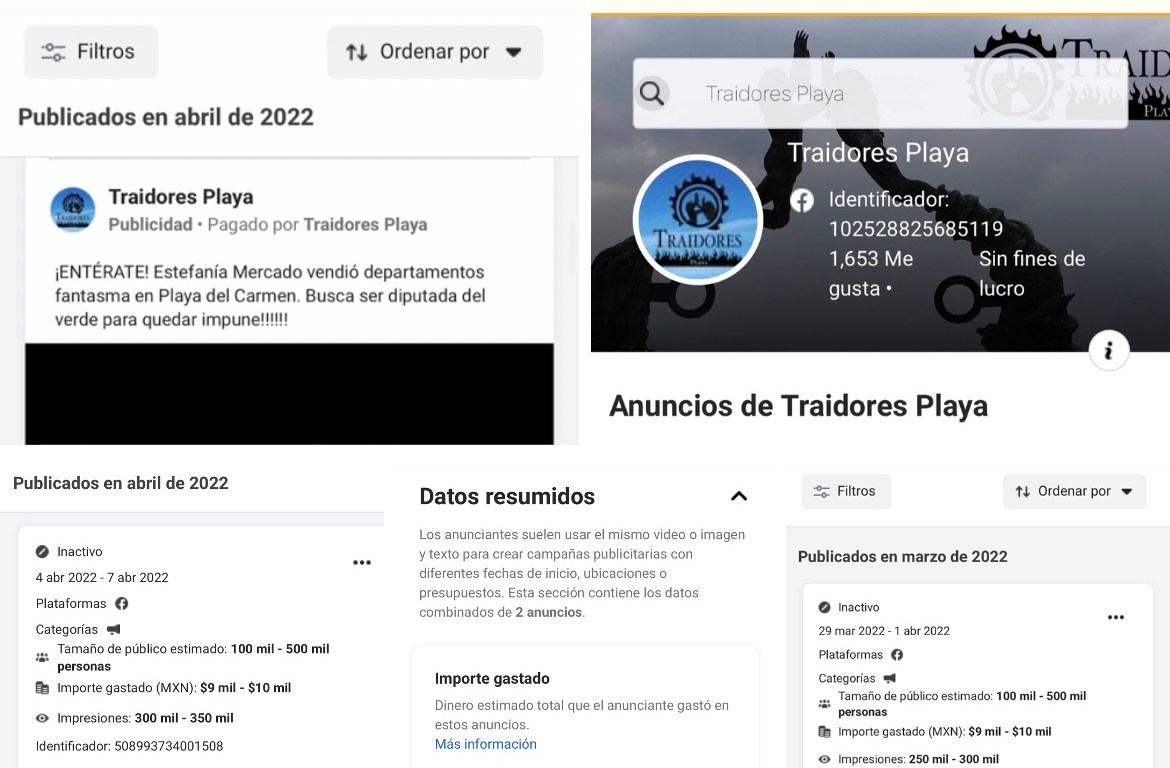 La página “Traidores Playa” ha publicado 27 videos en un periodo bimestral con una inversión cercana a los 243 mil pesos según información de la biblioteca de anuncios de Facebook disponible de manera pública.