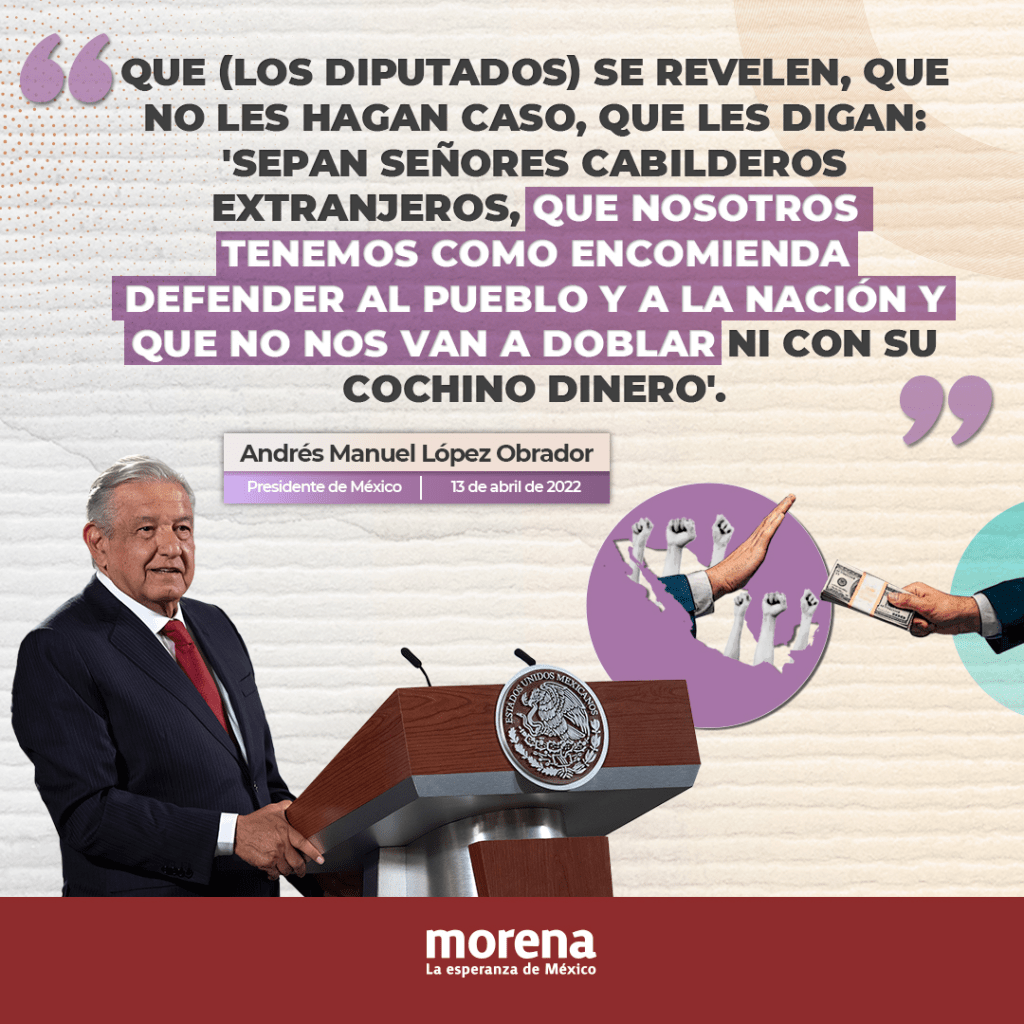 «Que les digan: ‘Sepan, señores cabilderos extranjeros, que nosotros tenemos como encomienda defender al pueblo y a la nación y que no nos van a doblar ni con su cochino dinero'», especuló.