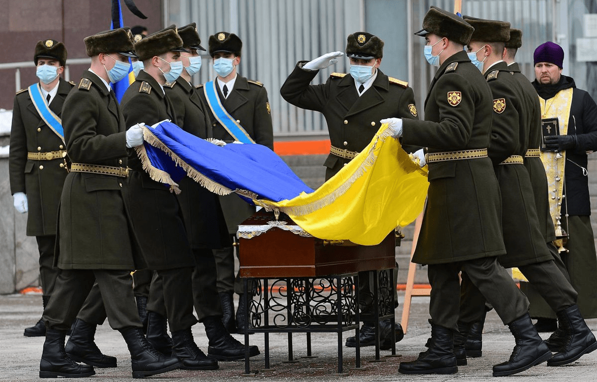 Soldados en Kiev transportan el cuerpo de un soldado muerto en la guerra. (13.04.2022).