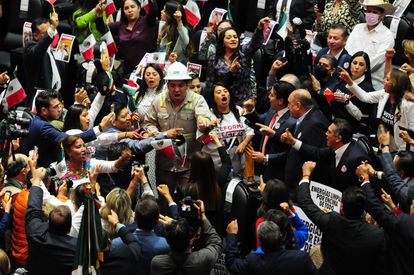 Los del partido guinda que acompañaban a su líder en la tribuna aprovecharon para espetar a sus adversarios. “Esos son, esos son, los traidores de la nación”, mientras aquellos respondieron: “No va a pasar, no va pasar”. Mier calificó el posicionamiento del coordinador del PAN, Jorge Romero, de medianamente sensato y acercado a la verdad, por lo que sorprende que digan que van a votar en contra. Por ejemplo, el panista expresó que no están por la desaparición de la Comisión Federal de Electricidad, sino por su empoderamiento en el sector. El morenista, quien fue señalado de no haber dado un adecuado procesamiento de la iniciativa, dijo a sus adversarios que si pensaban recibir maletas de dinero, estaban equivocados. Subordinarse al dinero y a las empresas extranjeras, como lo hicieron en 2013, es de malos legisladores. No hipotequen su honra, porque no habrá dinero para que la recuperen, pidió.