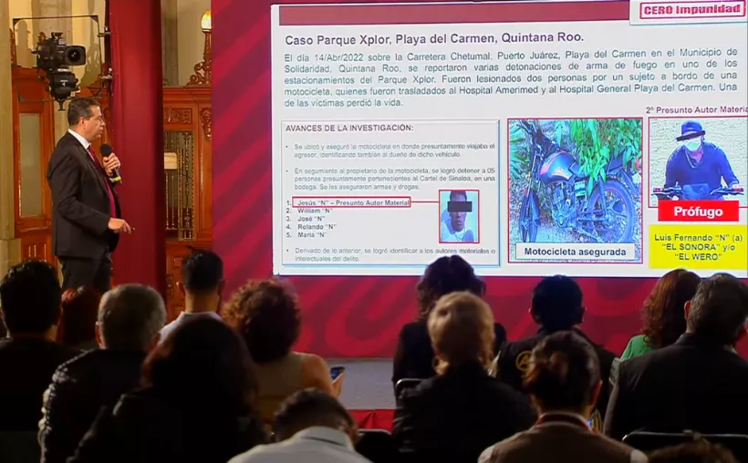 Durante la sección de Cero Impunidad, emitida en Palacio Nacional por el subsecretario de Seguridad y Protección Ciudadana (SSPC) , Ricardo Mejía Berdeja, dio a conocer los avances en la investigación tras el ataque armado a las afueras de un parque temático en Playa del Carmen.