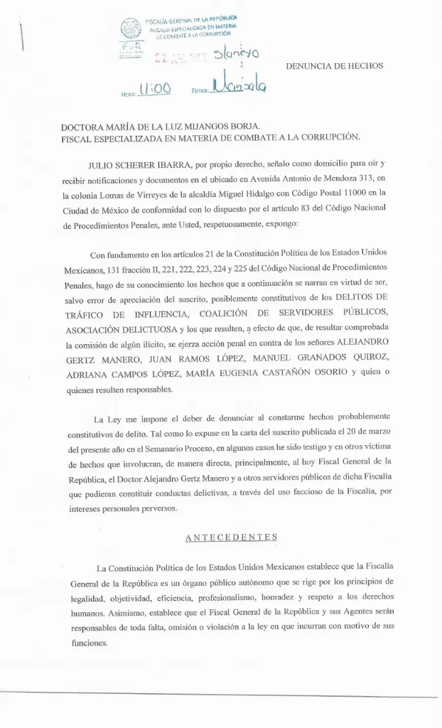 En su denuncia, Scherer vuelve a denunciar que el Fiscal General utiliza de manera facciosa la FGR relacionándolo con «hechos fabricados y productos de intercambio ilícitos de la FGR con particulares en casos relevantes para que interpongan denuncias en mi contra, a cambio de obtener cancelaciones de órdenes de aprehensión o para que les sean aprobados criterios de oportunidad a su favor».