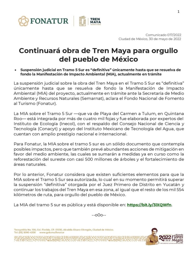 En su momento permitirá superar la suspensión “definitiva” otorgada por el Juez Primero de Distrito en Yucatán y continuar los trabajos del Tren Maya en esa zona, igual que el resto de los mil 554 kilómetros de ruta, «para orgullo del pueblo de México».