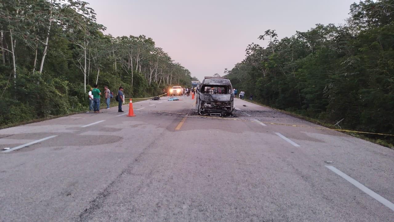 Realidades.- Una persona murió y otros 14 resultaron heridos esta madrugada, al estrellarse una motocicleta contra una “combi” de transporte público en la carretera de paga Playa del Carmen-El Tintal, misma que se incendió.