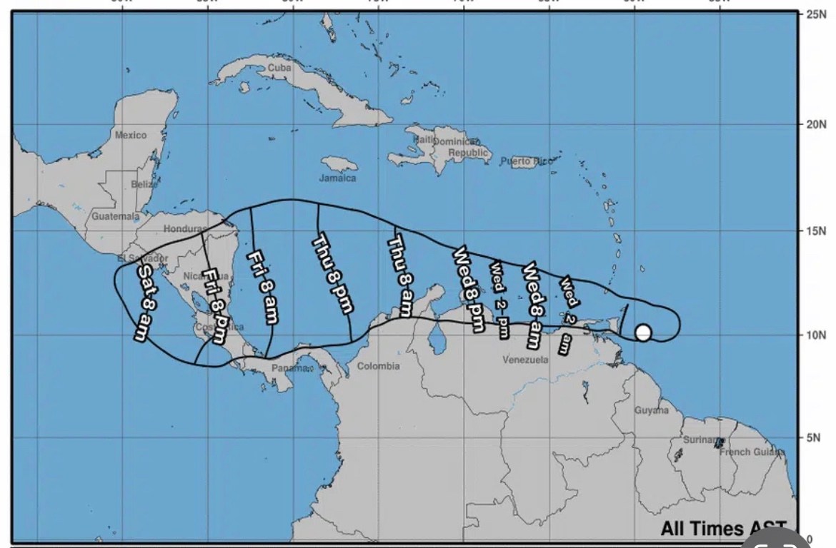En la trayectoria pronosticada, el sistema pasará cerca o sobre porciones del sur de las Islas de Barlovento la noche de este martes y se moverá sobre el sur del mar Caribe o cerca de la costa norte de Venezuela el miércoles y jueves.