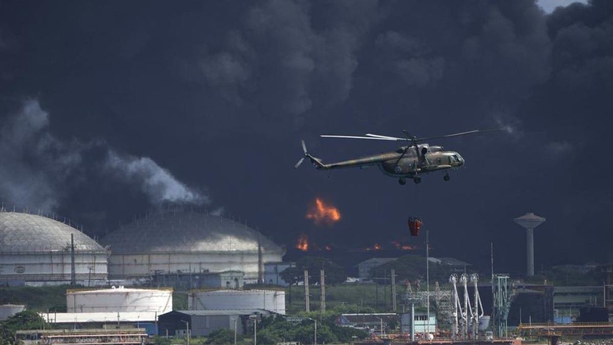 Las autoridades informaron que se instaló una bomba de gran porte que operan cubanos, venezolanos y mexicanos y que alimenta varios cañones que inyectan agua a presión, al tiempo que helicópteros y aviones también intentan sofocar el incendio y enfriar los tanques.