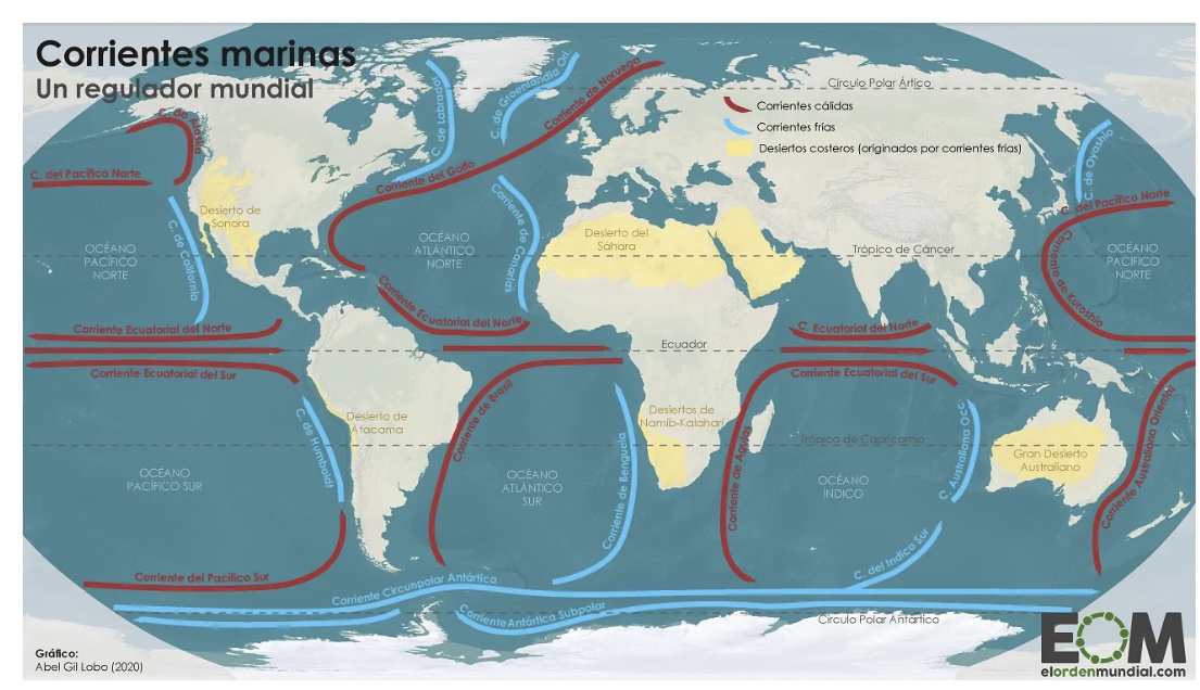 Realidades.- El sistema de corrientes marinas, el sistema de circulación oceánica, es uno de los elementos del medio natural que más afectan a nuestra vida, y sin embargo es también uno de los más desconocidos. Una de las funciones más importantes de las corrientes marinas es la circulación termohalina, que permite redistribuir el calor en el planeta desde las zonas tropicales a los polos.