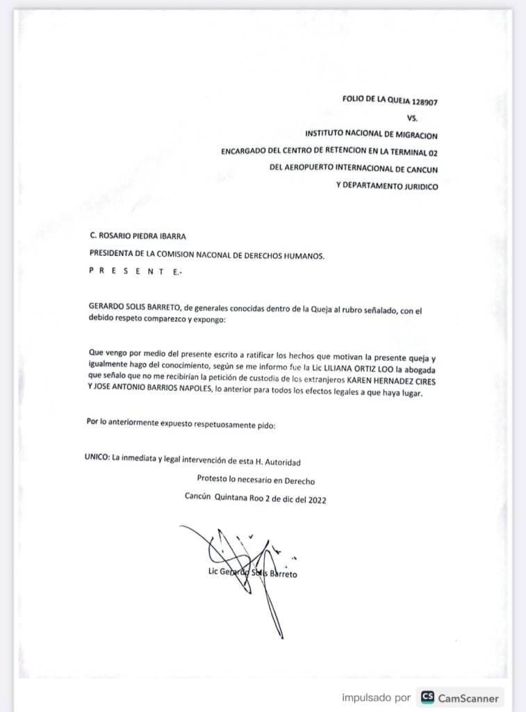 Realidades.- El abogado y activista Gerardo Solís denunció que el departamento jurídico del Instituto Nacional de Migración (INM) se negó a recibirle un oficio para solicitar a través de una asociación civil de derechos humanos, la custodia de una pareja de cubanos retenidos desde el 18 de noviembre de 2022 en el centro de retención de la terminal 2 del Aeropuerto Internacional de Cancún.