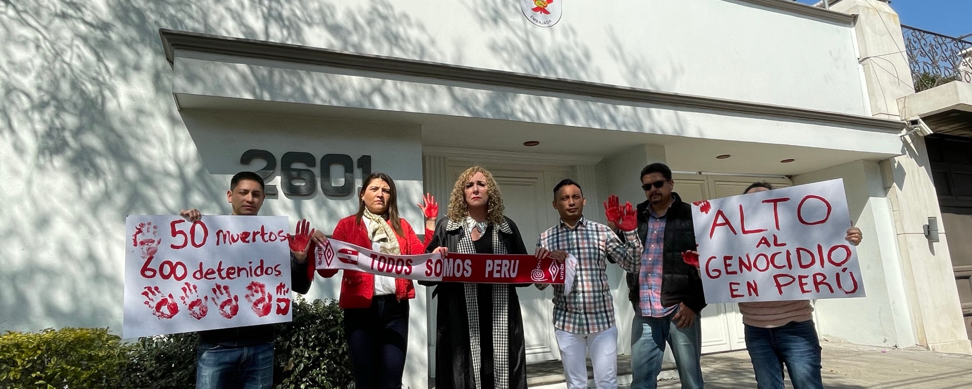 Ciudad de México a 19 de enero de 2023.- La Embajada de Perú ubicada en Lomas de Chapultepec de la capital mexicana fue sede de una protesta pacífica para denunciar el genocidio que está sucediendo en la zona serrana del Perú derivado de las protestas multitudinarias por la destitución del presidente Pedro Castillo que se encuentra en situación de preso político derivado de un golpe parlamentario sin el debido proceso del juicio político o judicial.