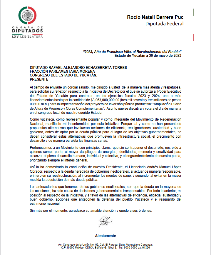 Aunado al posicionamiento de la diputada federal Rocío Natalí Barrera y representante del proyecto político de Claudia Sheinbaum en Yucatán manifestó por escrito su preocupación por la adquisición de la deuda pública en un escenario de opacidad en el manejo del proyecto presupuestal en Puerto Progreso.