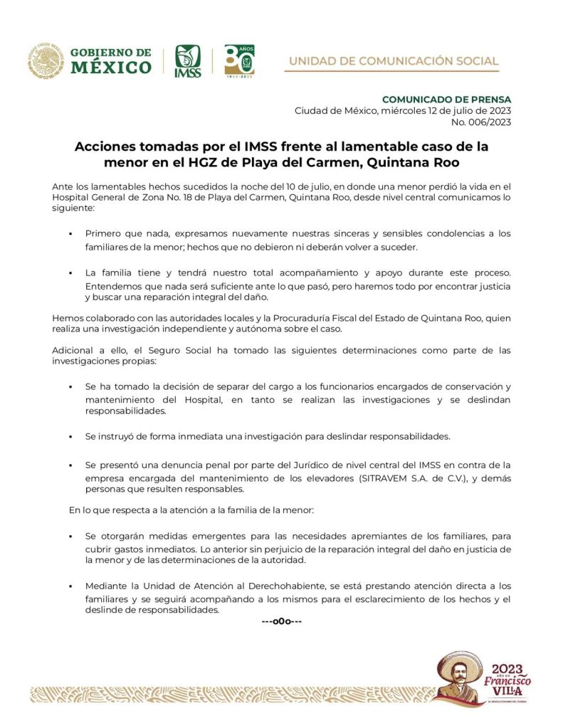 El IMSS publicó que presentó una denuncia penal en contra de la empresa SITRAVEM S.A. de C.V. por su responsabilidad en el mantenimiento del elevado del Hospital General de Zona No. 18 de Playa del Carmen.