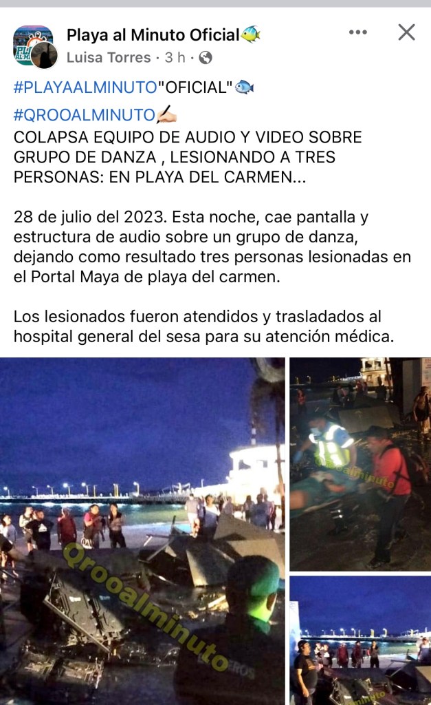 En el otro escenario de la Plaza Fundadores hubo tres personas heridas a las que les cayó encima una pantalla derivado de la mala organización y la lluvia.