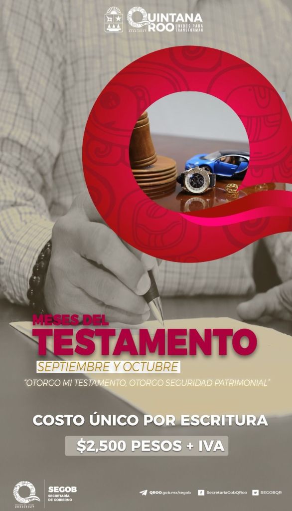 Como se sabe, la Secretaría de Gobernación estableció en 2003 que septiembre sea el “Mes del Testamento” con el objetivo de contribuir a la cultura de la legalidad y certeza jurídica previendo la disposición de los bienes patrimoniales. En Quintana Roo el programa ha evolucionado y en la actualidad su vigencia es de dos meses, esto es, durante septiembre y octubre.