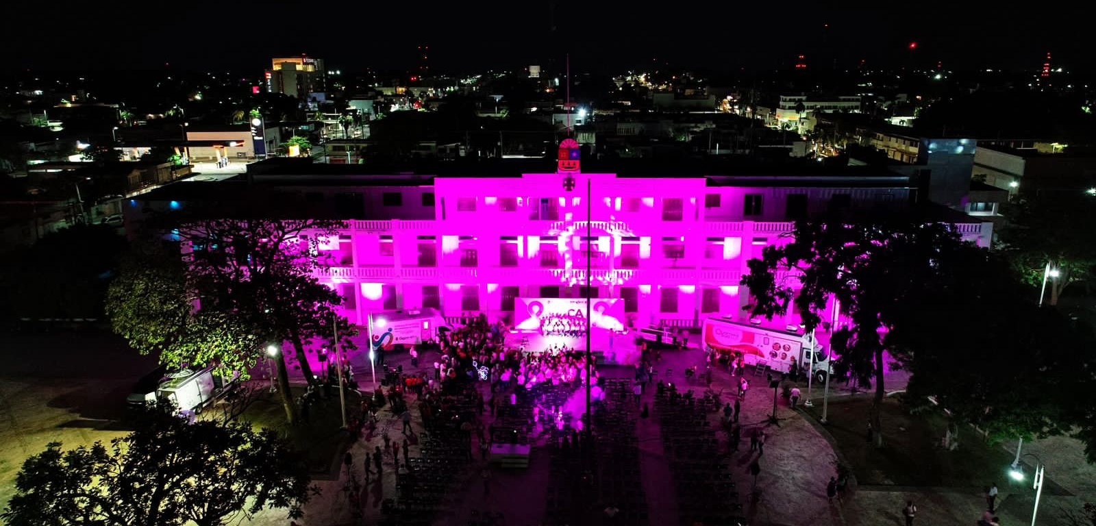 Chetumal.- La gobernadora Mara Lezama presidió el encendido de luces color rosa en Palacio de Gobierno, en el marco de las actividades de Octubre, mes de la sensibilización sobre el cáncer de mama e hizo un llamado a las mujeres a realizarse la autoexploración.