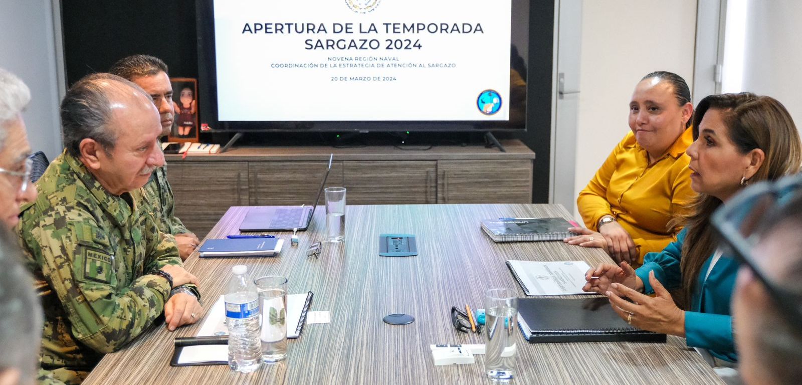 La gobernadora Mara Lezama Espinosa se reunió con el secretario de Marina Rafael Ojeda Durán, para llevar a cabo el despliegue y operativo que se desarrollará entre la SEMAR y el Gobierno del Estado para esta labor con equipamiento, barreras, personal, buques sargaceros, embarcaciones, maquinaria, boyaje y ancleo para los 8,650 metros de barrera protectora.