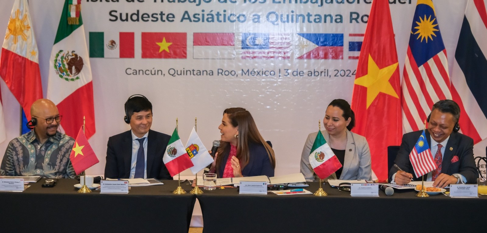 La gobernadora Mara Lezama Espinosa, acompañada de la secretaria de Desarrollo Económico (SEDE) Karla Almanza López; dio la bienvenida a los diplomáticos de Vietnam, Filipinas, Malasia, Indonesia, Tailandia; a los embajadores concurrentes de Singapur, Camboya, Laos, Birmania.