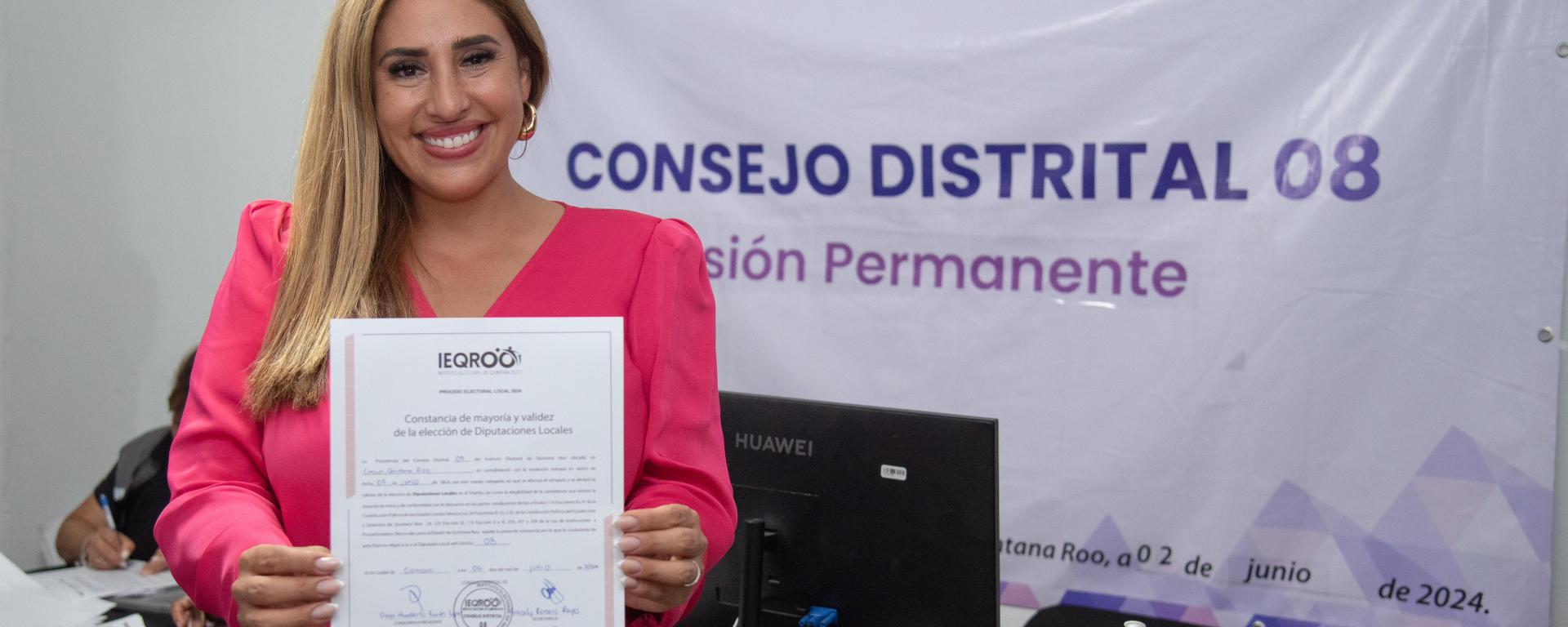 Cancún.- Jimena Lasa recibió su constancia de mayoría y validez por parte del Instituto Electoral de Quintana Roo (IEQROO) que la acredita como diputada electa por el Distrito 8 de Cancún.