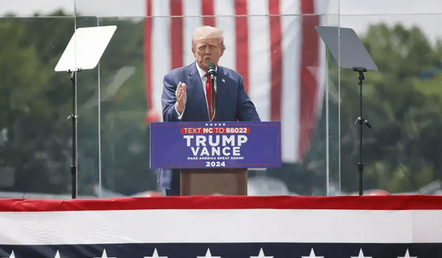 Reaparece Trump en un mitin público detrás de un cristal blindado